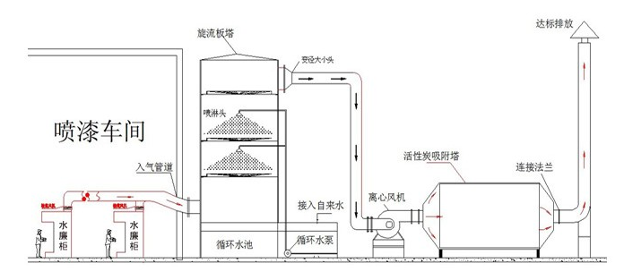 排除的酸霧廢氣→進(jìn)入風(fēng)管→經(jīng)過(guò)酸堿廢氣處理塔→風(fēng)機(jī)→風(fēng)管→達(dá)標(biāo)排放。